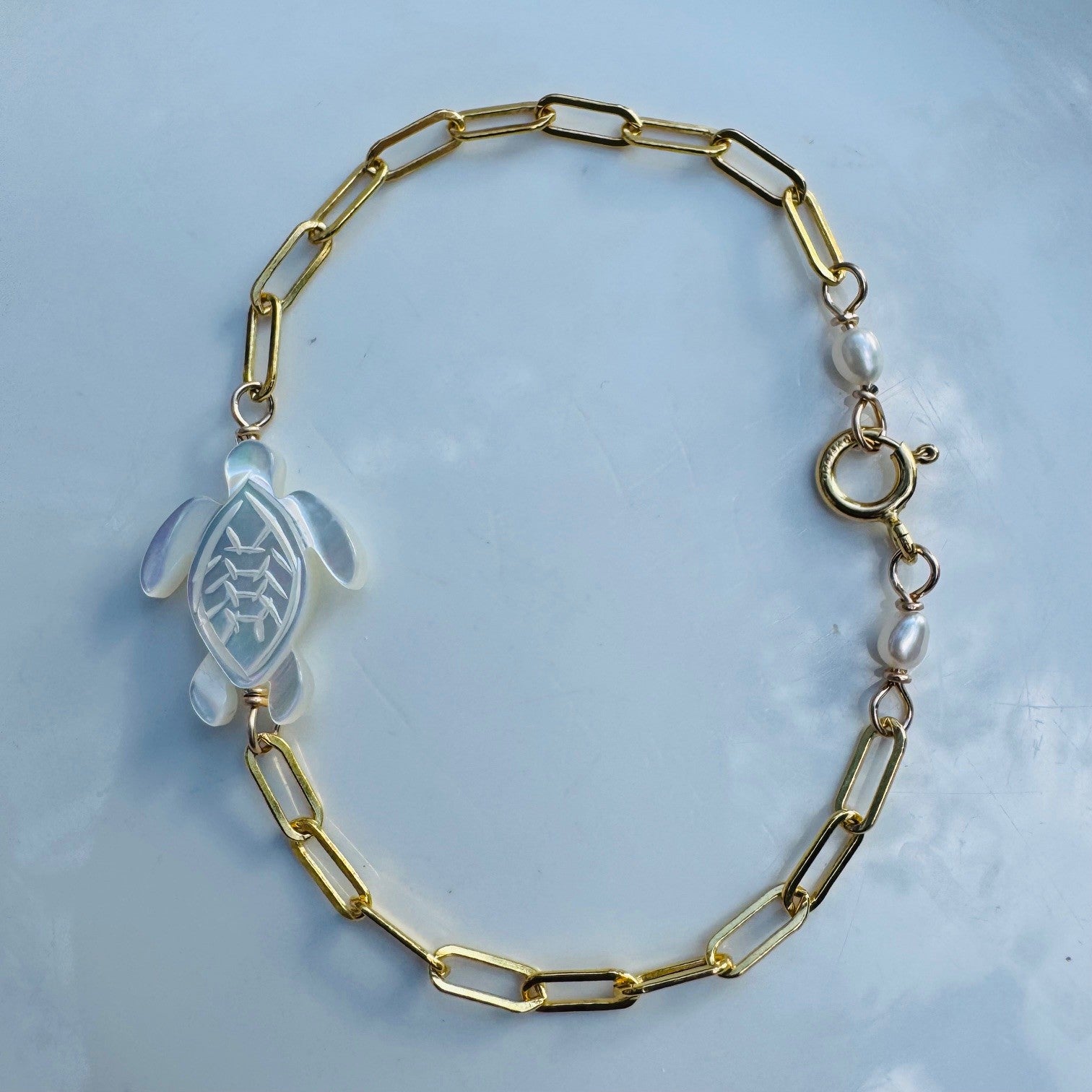 Abalone Mother of Pearl Turtle Bracelet. 14Kt gold filled chain and clasp. Also available in White Mother of Pearl (let us know what color you prefer during checkout in the "notes" section). It is believed, that the Abalone shell gives protection and emotional balance to the wearer and blesses them with tranquility. This Lariat Necklace is very versatile and can be used as backless jewelry, too. Please see the picture for that look. Buy yours today!