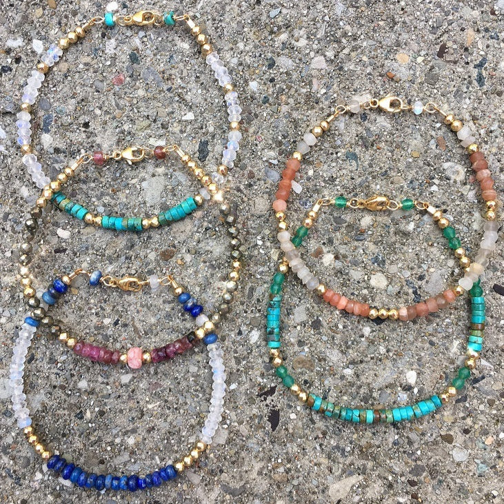 Colorful Gemstone Bracelets. These Bracelets are Beautifully adorned with semi-precious stones in: Lapis, Moonstone, Pyrite, Green Onyx & Blue Kyanite. You can wear them alone or layered like in this picture. Buy yours today for $84/each!