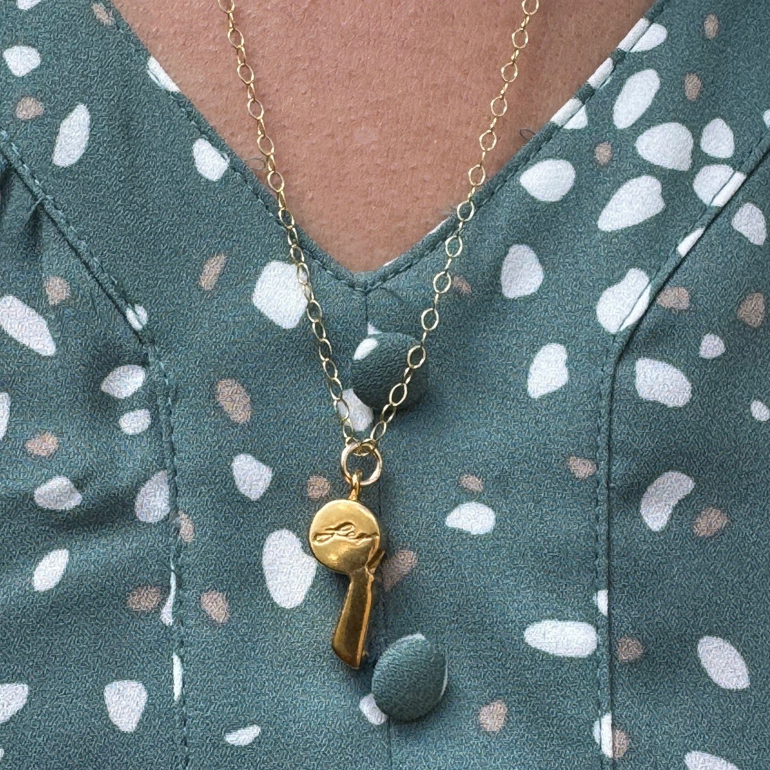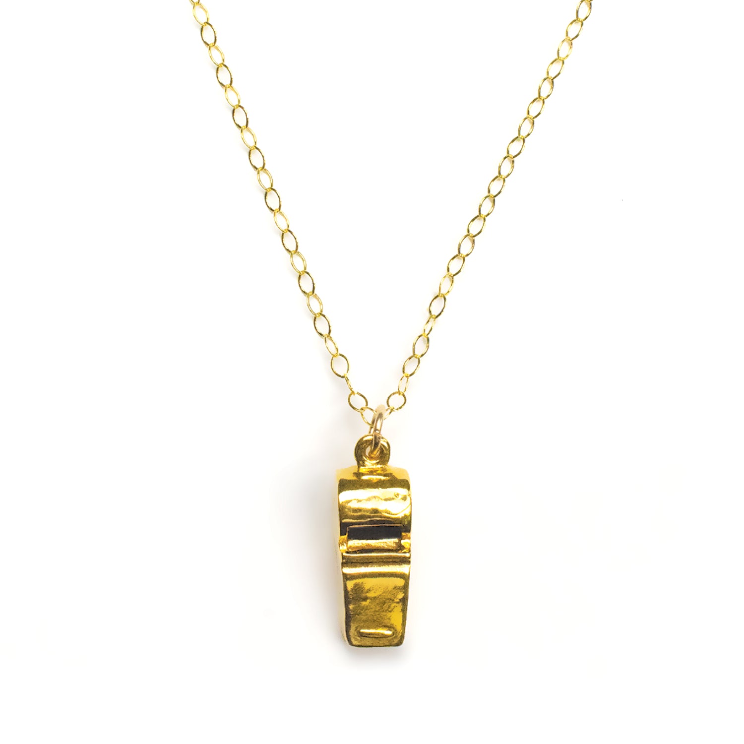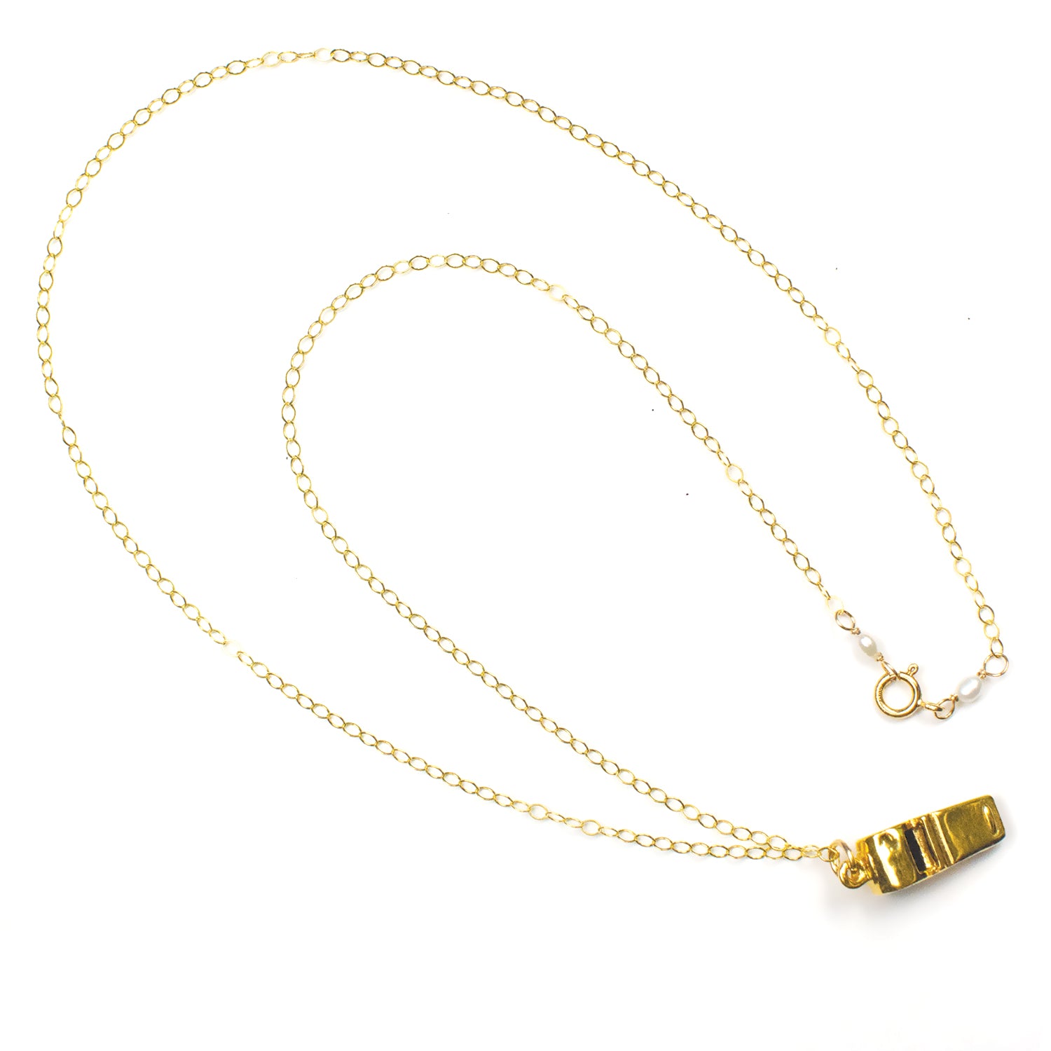 Make some Noiseee with this hip one-of-a-kind working Whistle Necklace, perfect to cheer your favorite sports team and favorite music band and/or to use for self-defense when walking alone. This fully functional whistle makes a loud high pitch sound when blown. The whistle is gold-plated bronze and measures approximately 10mm wide x 25mm high x 10mm deep. The chain and clasp are 14/20 gold filled and measures 24" in length. Two tiny white rice pearls adorn the clasp.