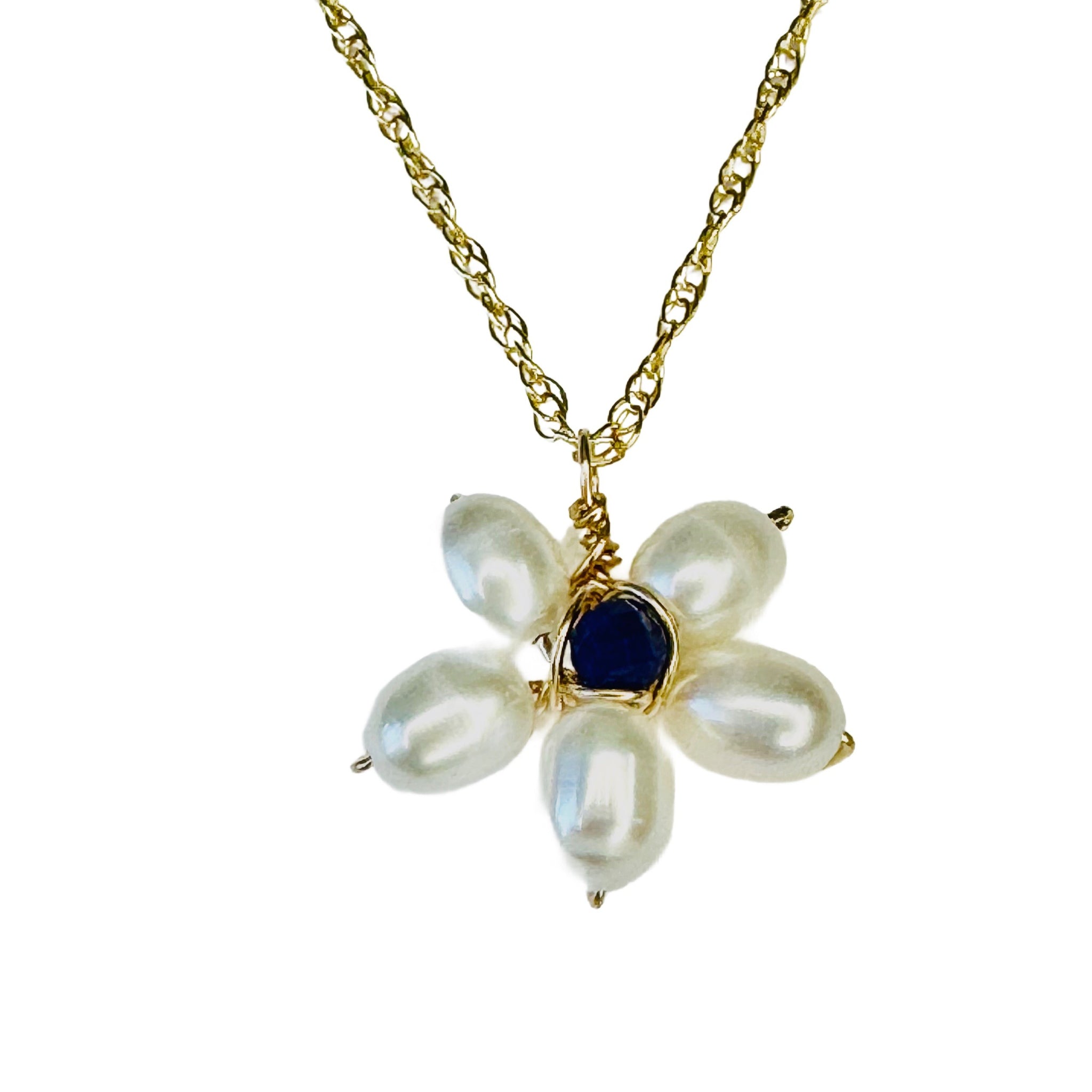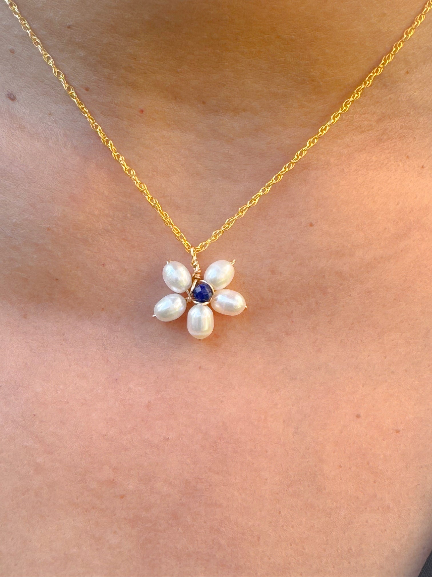 Discover the timeless elegance of the Lapis Pearl Blossom Necklace. Handcrafted in the USA, this refined 16" necklace features a delicate 14/20 gold-filled rope chain adorned with luminous freshwater pearls and a rich lapis centerpiece. Meticulously hand-formed, each piece celebrates artisanal craftsmanship and the natural beauty of thoughtfully selected materials—making it a sophisticated, everyday heirloom for any jewelry collection. Measurements (Inches & Millimeters): Necklace length: approximately 16 in / 406 mm. Flower pendant: approximately 3¼ in / 83 mm.