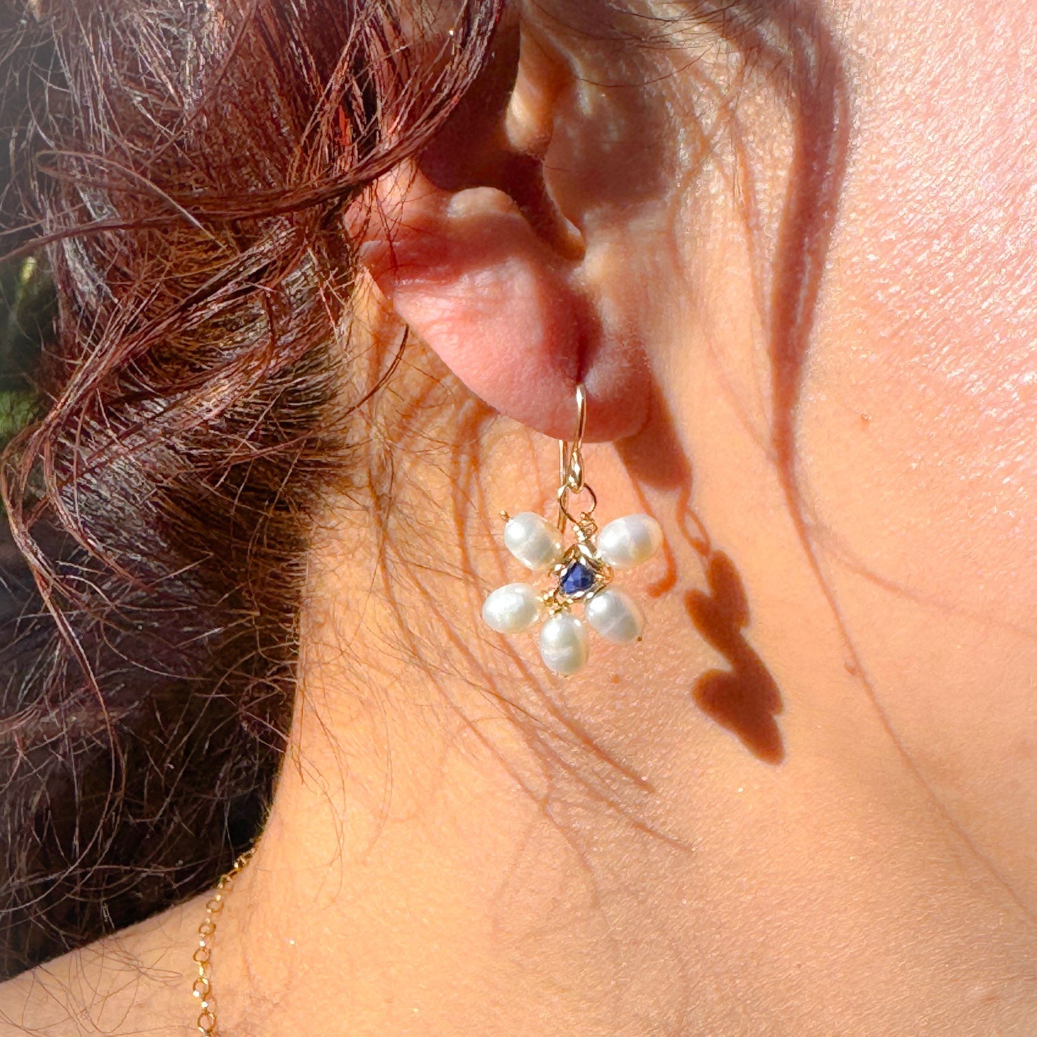 Handcrafted in the USA, these floral-inspired earrings feature luminous freshwater pearls arranged around a deep blue gemstone center. The natural glow of each pearl creates soft dimension, while the rich central accent adds subtle contrast. Suspended from gold-filled hooks and hand formed with gold-filled wire, they offer graceful movement and timeless elegance for both everyday wear and elevated occasions.