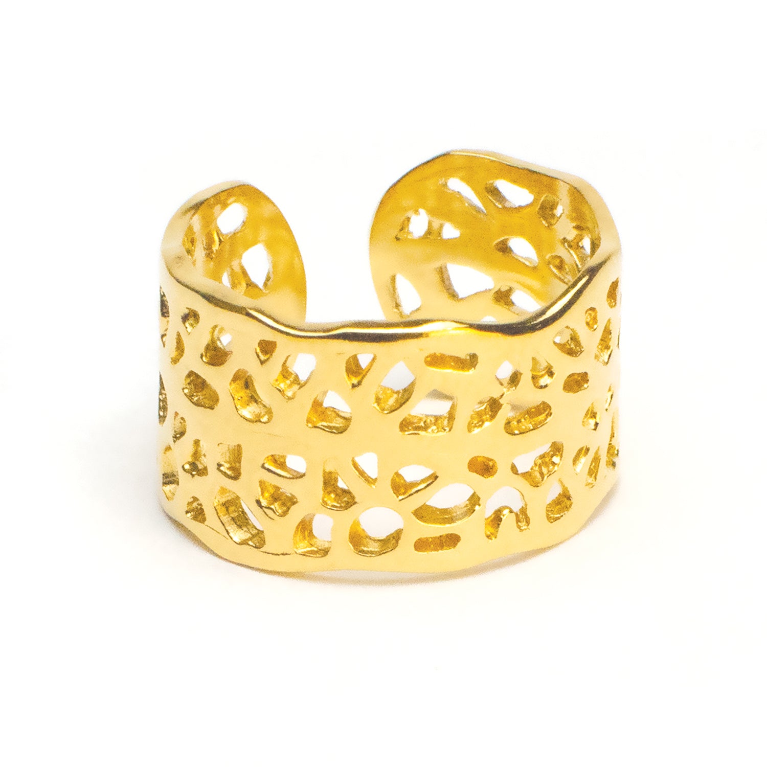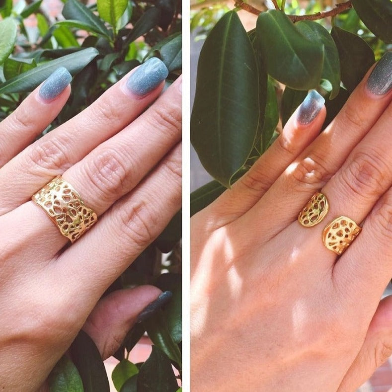 Inspired by the natural beauty of Sea Fans found under the sea, this organic style ring is reversible, allowing you to wear the ring with the opening to the front or to the back—effortlessly blending versatility and elegance in one unique design. Whether you prefer a subtle accent or a bold statement, this ring adapts beautifully to your style. Made of gold-plated bronze and adjustable to fit US Ring sizes 6 to 8 approximately.