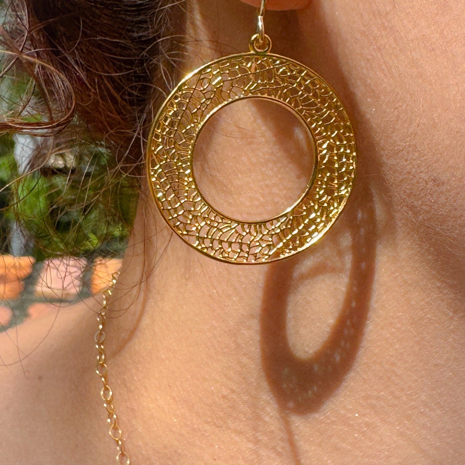 Inspired by the intricate beauty of ocean coral, our Sea Fan Hoops bring a touch of the sea to your style. Crafted in gold-plated bronze with 14kt gold-filled hooks, these earrings feature an airy, lace-like texture that catches the light with every movement. Measuring approximately 32mm wide x 35mm high, they’re the perfect balance of statement and elegance. Handcrafted in the USA with love, these versatile hoops transition effortlessly from everyday wear to special occasions.