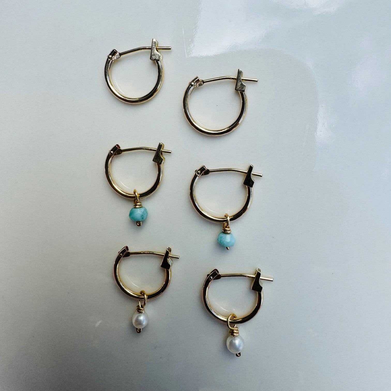 Always Mine Sweet 10KT Gold Hoops. Versatile 10KT Gold Hoops — Wear Them Alone or With a Drop. Delicate, timeless, and thoughtfully designed, our Always Mine Sweet 10KT Yellow Gold Hoops are beautiful on their own — and effortlessly elevated with our interchangeable Larimar or Freshwater Pearl drops. Crafted from premium 1.4mm tubing with a secure hinged click-post closure, these 12mm hoops are perfect for everyday wear, yet refined enough to customize for any occasion.