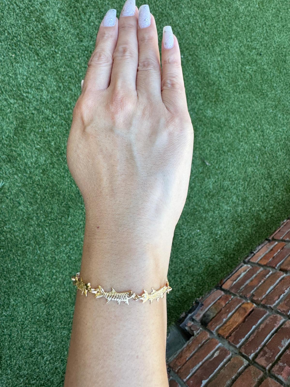 Embrace the allure of the ocean with this striking tarpon bracelet, handcrafted in the USA from lustrous gold-plated bronze. Lexi Jewelry's signature tarpon charm captures the essence of strength and grace, suspended elegantly on your preferred chain style. Whether you're drawn to coastal aesthetics or seeking a meaningful symbol of resilience, this versatile piece transitions seamlessly from everyday wear to special occasions. Let this sea-inspired treasure become your go-to accessory for adding sophistication and character to any look.