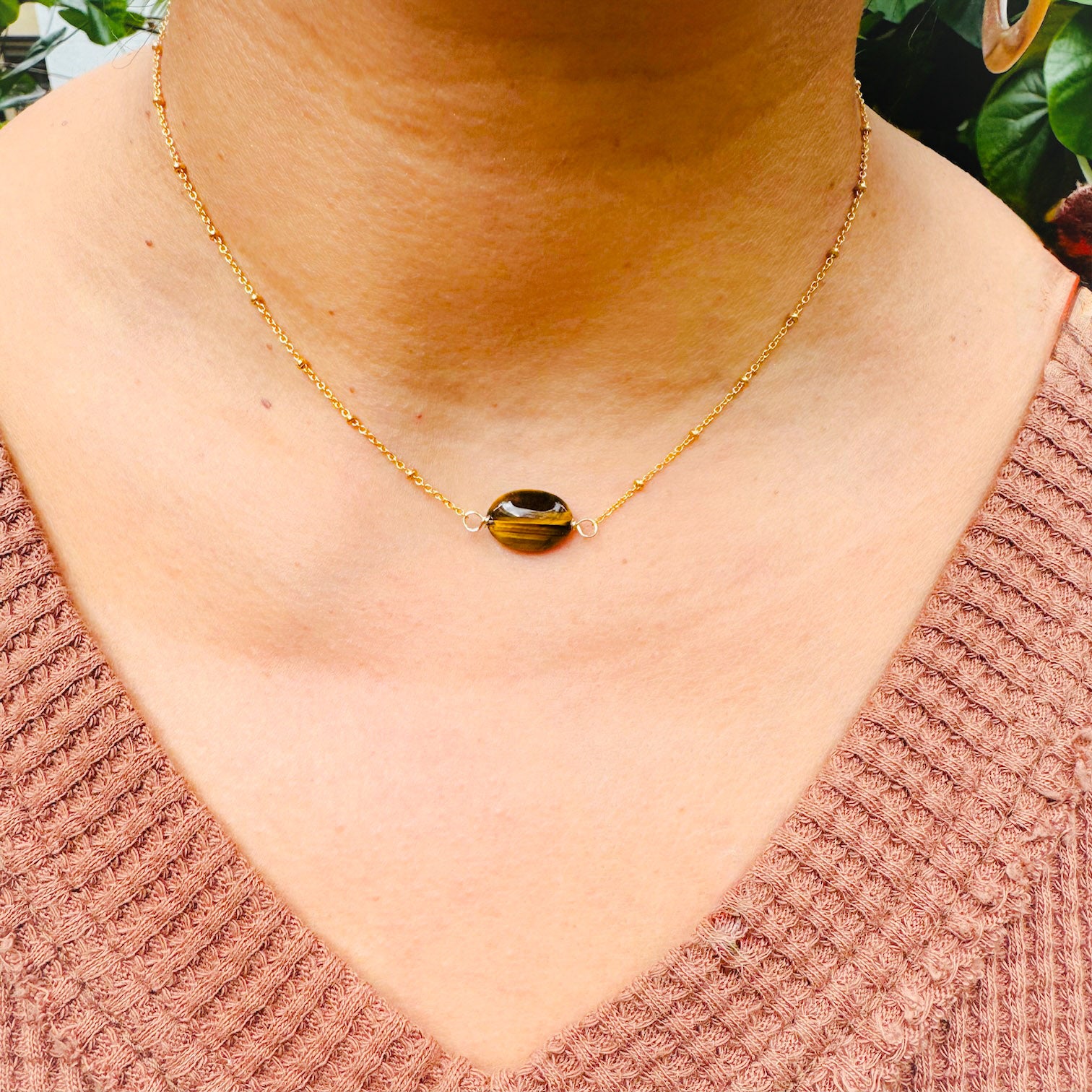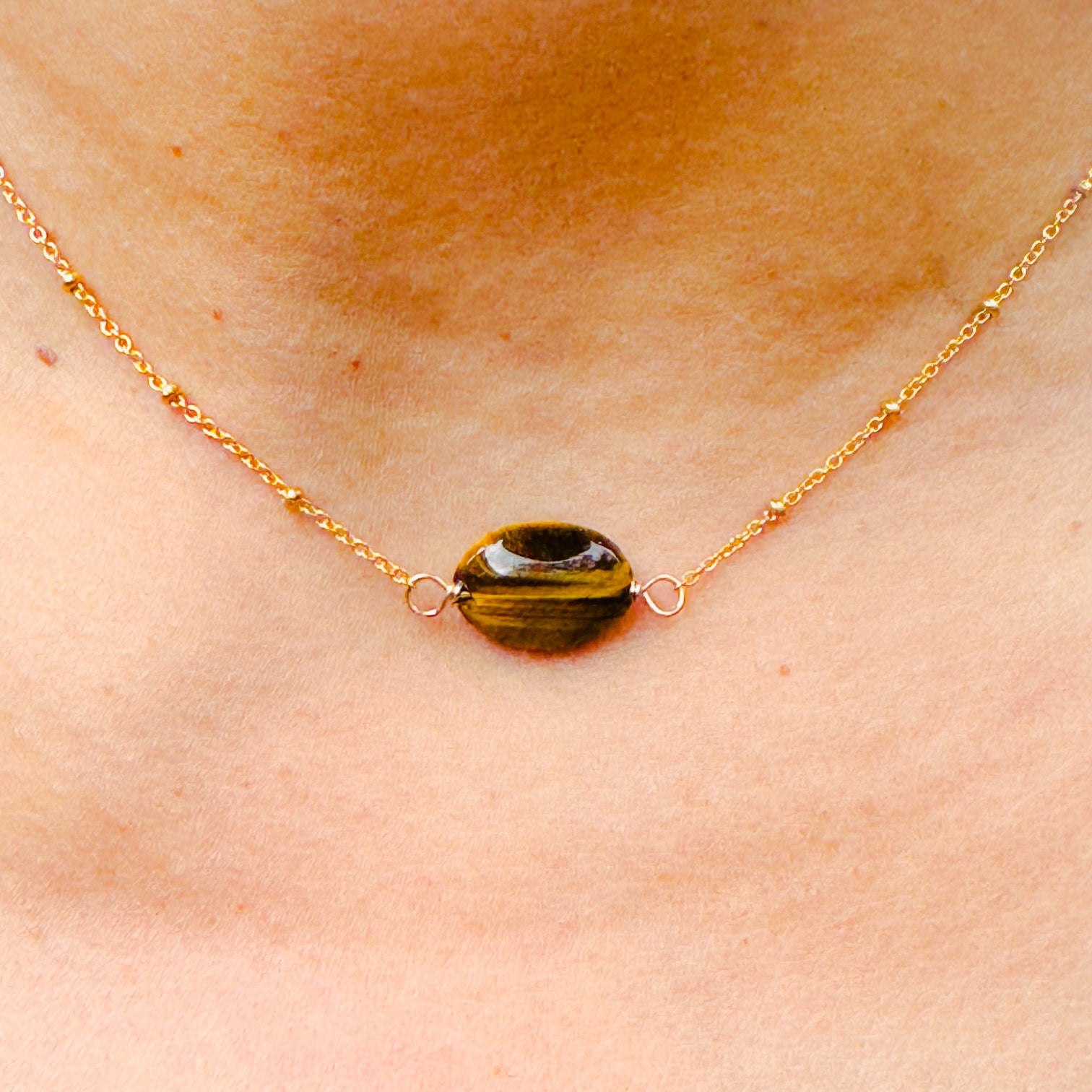 Elevate your style with the Tiger Eye Oval Necklace, featuring a stunning oval tiger eye stone that adds a natural, warm glow to any outfit. Suspended on a delicate gold-plated rosary chain, this 16-inch necklace is finished with a durable 14/20 gold-filled clasp and wires, ensuring lasting shine and comfort. Perfect for daily wear or special occasions, this unique piece blends elegance and earthy charm effortlessly. Discover timeless sophistication for ONLY $128.