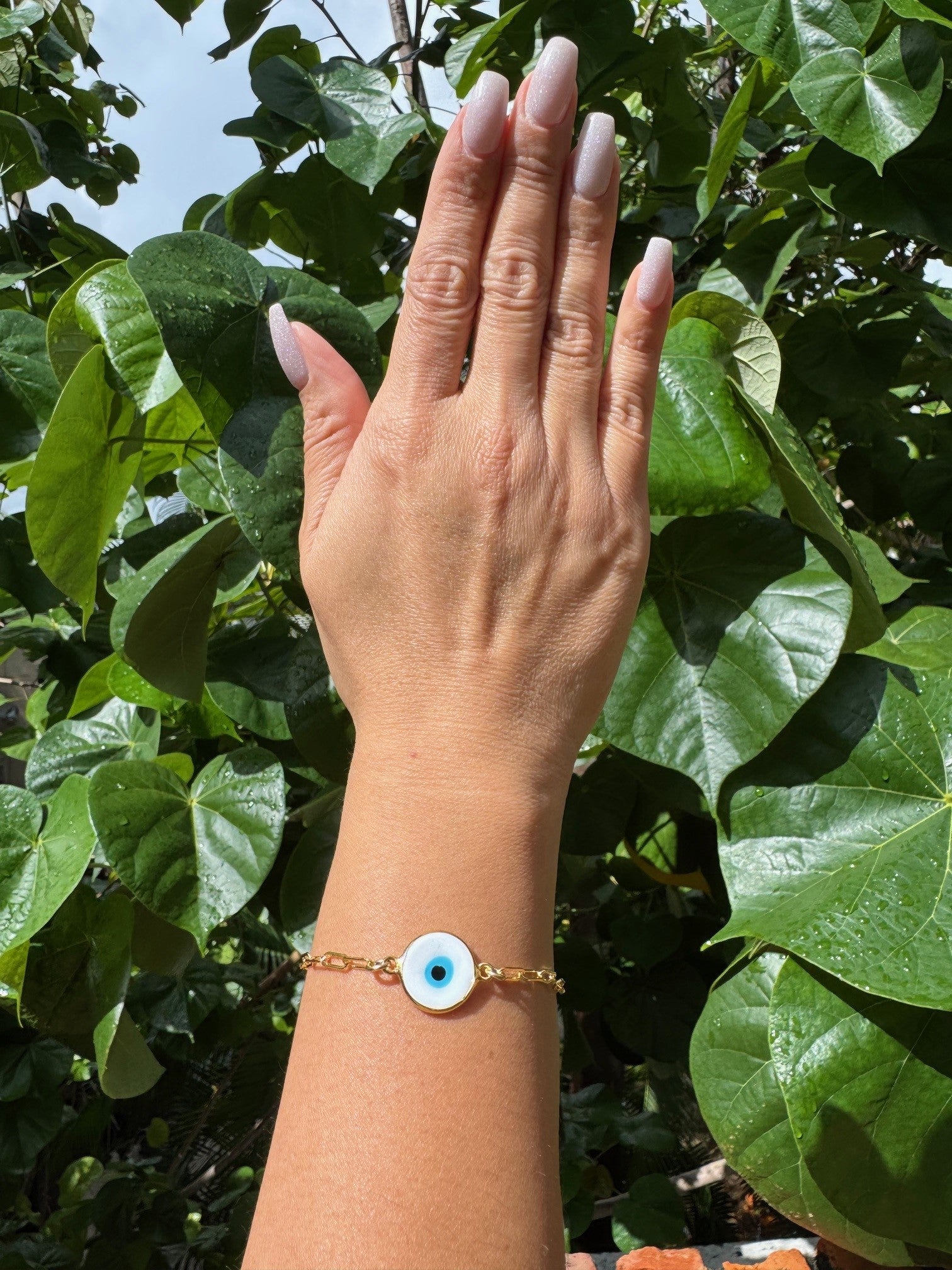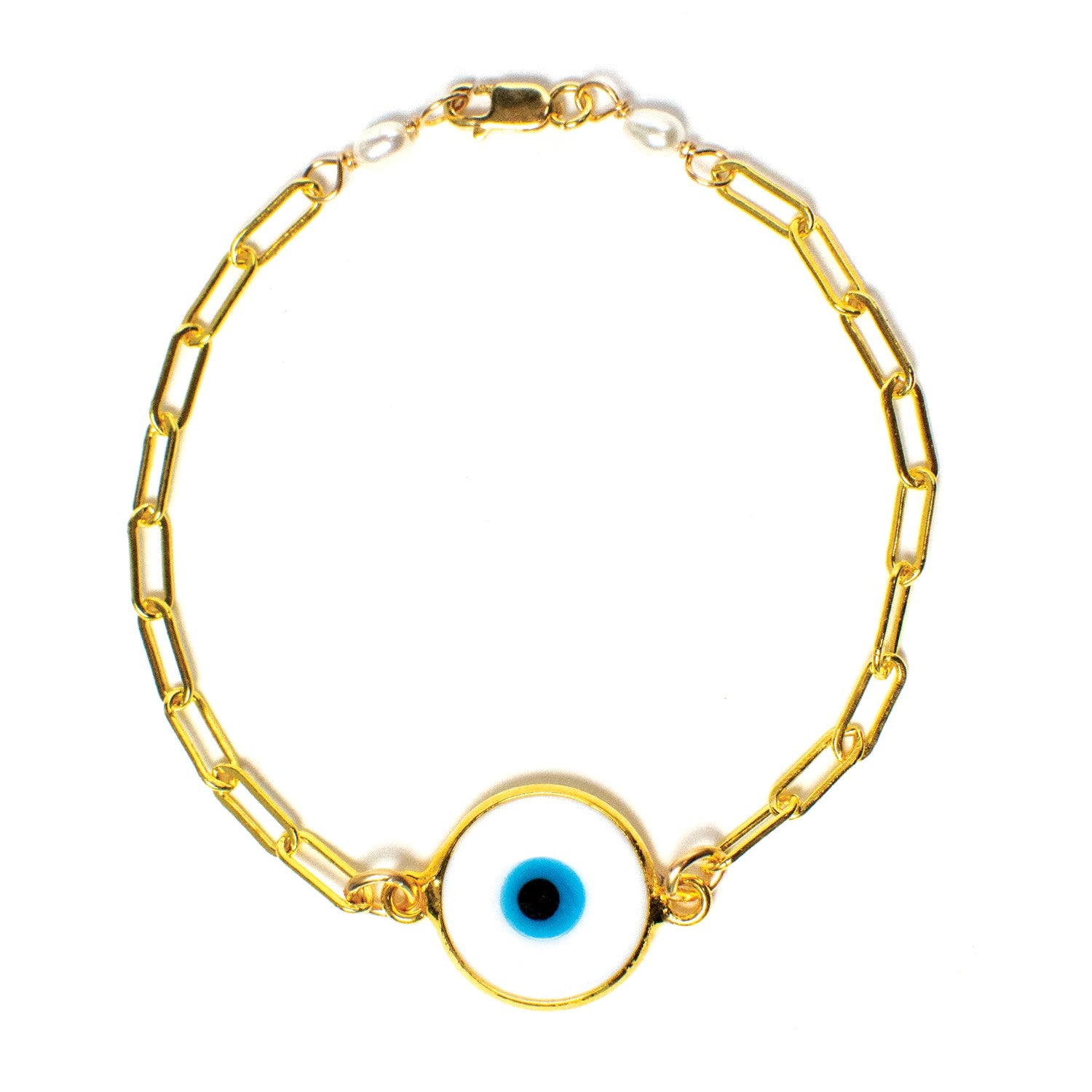 Designed to deflect looks of envy, this White Evil Eye Bracelet is designed to ward off negative energy and add protection to its wearer. The white eye is glass with a gold plated border and measures approximately 15mm in diameter. The paper clip style chain is 14/20 gold filled, as well as the clasp. Two small white rice pearls adorn the closure. The bracelet is 7 inches long.